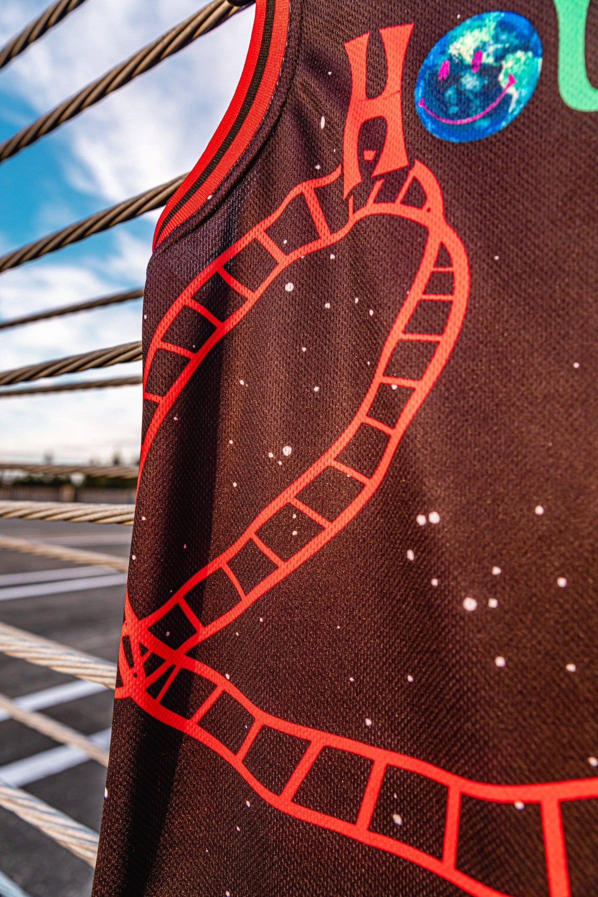 If you're looking for the most unique and trendy basketball style, then grab this SRELIX “Space” Jersey. This piece boasts a starry jersey pattern, looping roller coaster tracks, and a colorful bold wordmark to showcase your team’s identity. Once you put this jersey on, you’ll be sure to stand out in a crowd, while displaying your fandom for your favorite player/team.